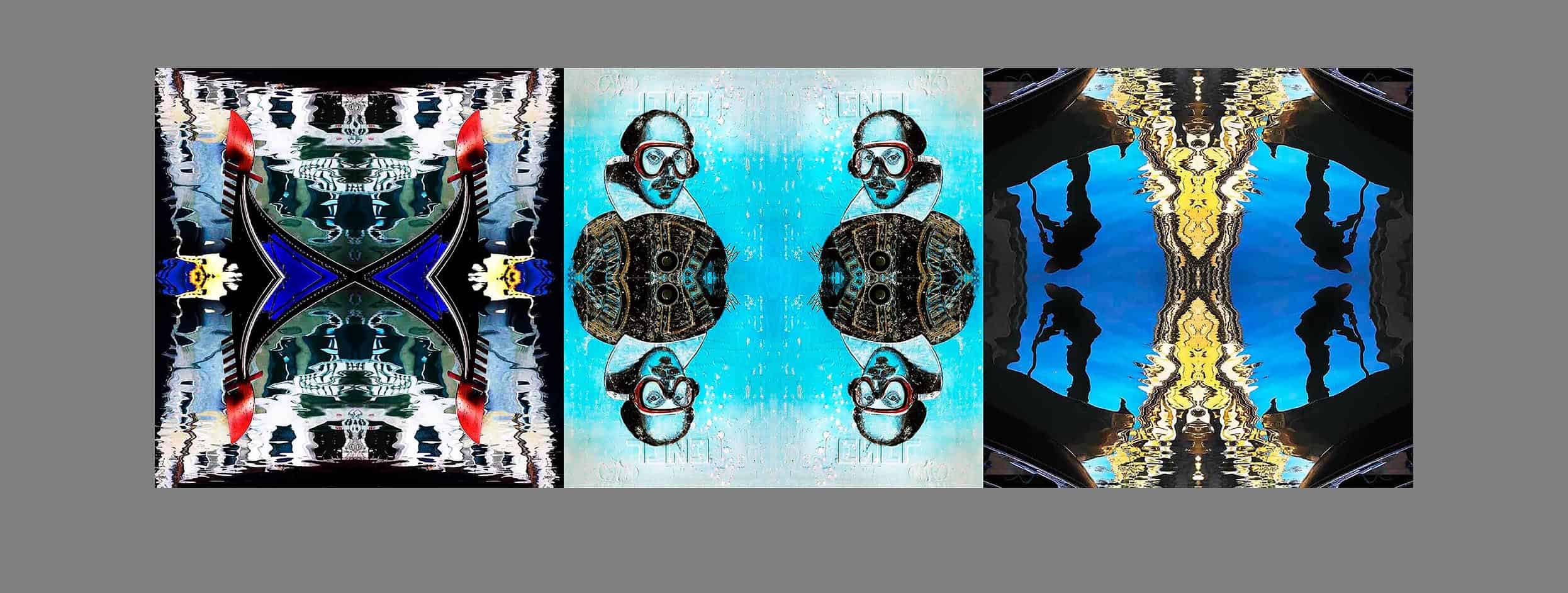 In the imagery presented in this post and his three others linked below, Ian Coulling creates a new visualisation of the Venetian urban landscape. A single original photograph, together with three other horizontally and vertically reversed images; were combined to form a new composite. Photographs were selected for showing how direct and reflected light, acts at the interface of air and water; to produce the magic, of “reality and illusion”, or in other terms “solidity and liquidity”. Others were chosen, capturing reflected light only, giving a more abstracted effect.