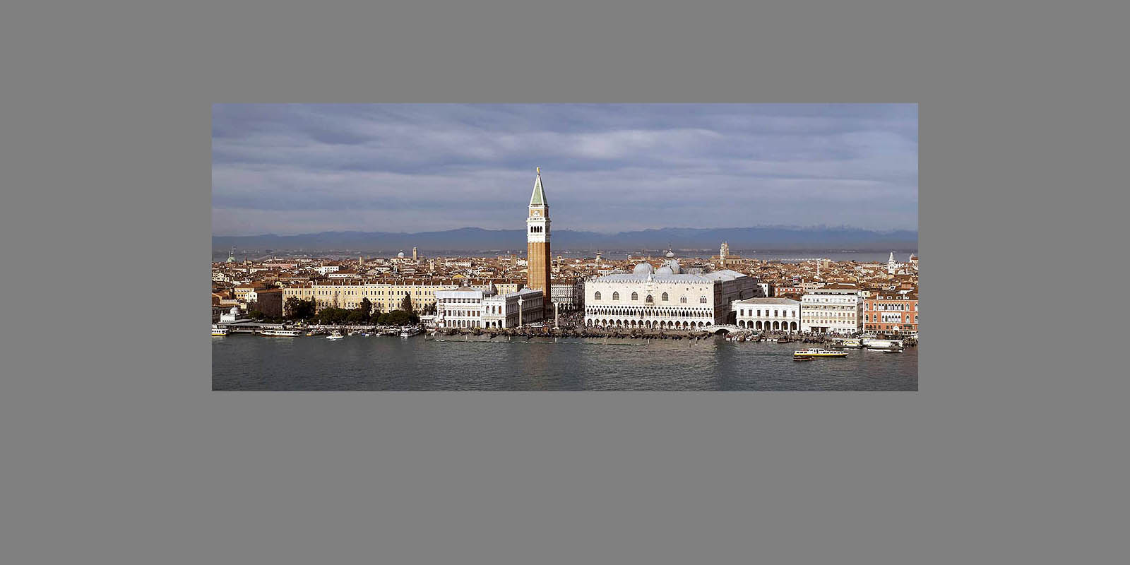 “View from the Campanile on San Giorgio di Maggiore, overlooking St Mark’s Square, Venice“.